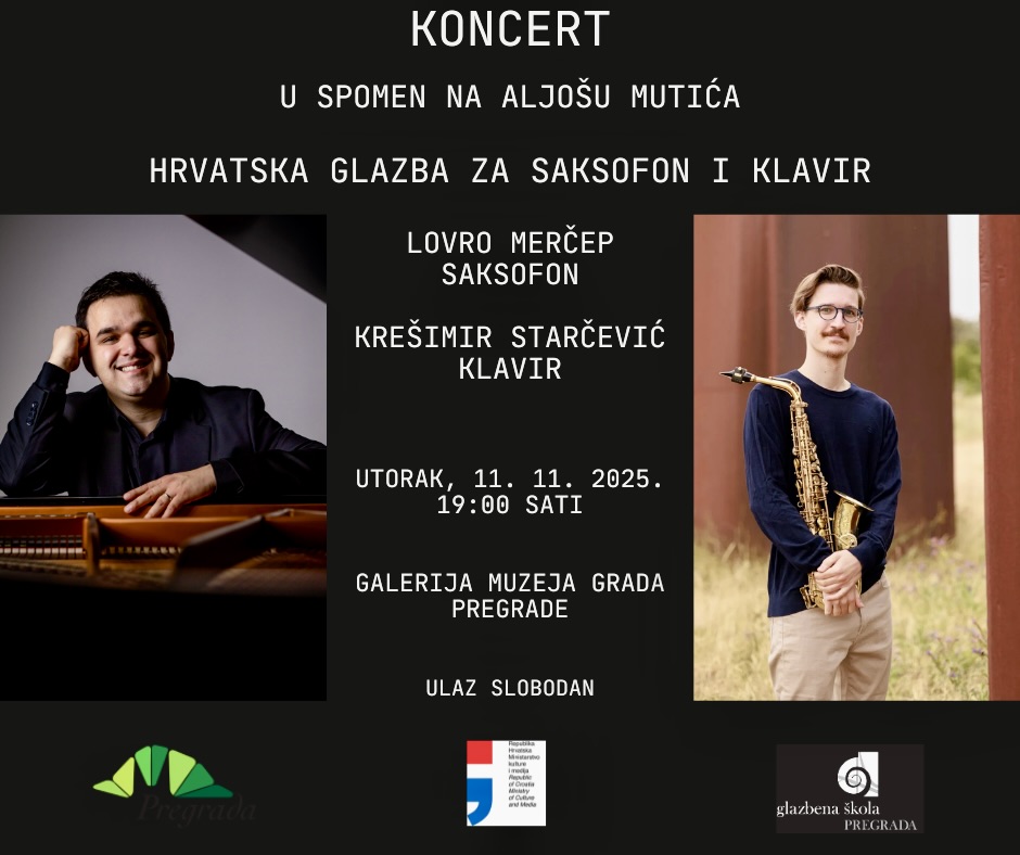 Pozivamo vas na koncert u utorak, 11. studenog 2025. s početkom u 19:00sati u Galeriji Muzeja grada Pregrade. Na programu su djela hrvatskih skladatelja (Horvat, Bergamo, Vlahek, Tudor, Palanović i Detoni) te nam je svima pružena jedinstvena prilika pobliže upoznati domaće autore u izvedbi mladih hrvatskih glazbenika. Koncert je organiziran uz sufinanciranje Ministarstva kulture i medija Republike Hrvatske.