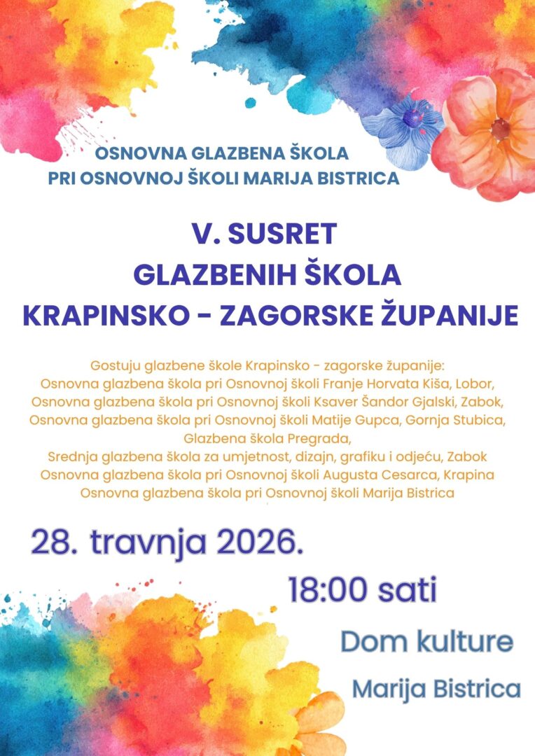 Pozivamo vas na V. susret glazbenih škola Krapinsko – zagorske županije koji će se održati u utorak, 28. travnja 2026. u Domu kulture u Mariji Bistrici s početkom u 18:00 sati.